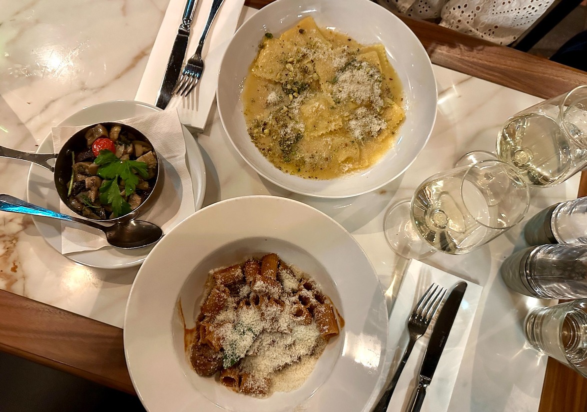 De ravioli gevuld met pompoen in een saus van boter, met parmezaanse kaas en pistachenoten doet ook niet onder in stevigheid. Bij het opdienen van de pasta’s arriveert er een gigantische (in de lijn van de maat van het menu) schaal met parmezaanse kaas, waaruit royaal wordt gestrooid.