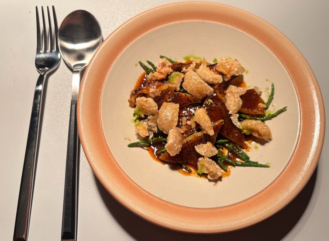 De lijn van techniek en verrassing werd voortgezet met het gerecht dat volgde. Het was inktvis met varkensjus, op een bedje van zeekraal, met zwoerd. De inktvis was eerst gemarineerd in shio koji voordat deze, net als bij de makreel, kort werd bewerkt met de brander. De combinatie met varkensjus, die tweemaal was gereduceerd, was onverwacht en bracht ons helemaal in de wintersferen. Door de uitgesproken smaken neigde het haast meer richting wild, dan vis. Dit gerecht was voor ons de ster van de avond en zou niet misstaan op een kerstmenu.