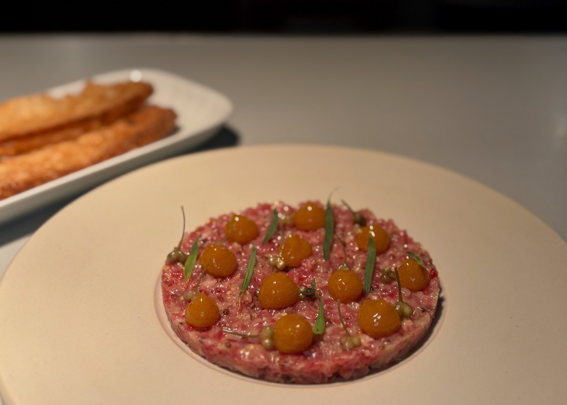 De uitgesproken smaken bleven terugkomen bij elke gang. Soms was het een duidelijk samenspel van verschillende smaken, zoals bij de makreel, en andere keren werden de verschillende elementen juist één geheel. Dit was duidelijk bij de dry aged steak tartaar. Deze bevatte unieke elementen zoals daslook kappertjes, dragon, en eigeel dat langzaam sous-vide was gegaard. Samen vormden ze een zacht, smaakvol geheel, dat ook nog eens prachtig was opgemaakt. Jons wereldwijde ervaring in topkeukens is duidelijk terug te zien; niet alleen in de technieken die worden gebruikt, maar ook in de zorg waarmee de borden zijn opgemaakt.