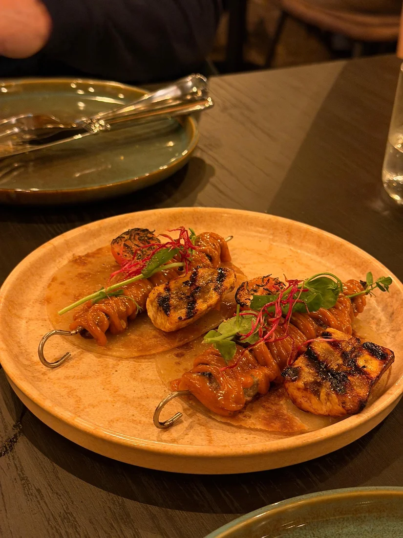 We trappen het diner af met een zoete aardappelkroket. Krokant van buiten, zacht van binnen. Maar het zijn de toppings die dit gerecht optillen: crispy gari (een soort cassave vlokken), Scotch bonnet chutney, smokey tatashe (een Nigeriaanse soort peper) en heerlijk zoete gekarameliseerde uien. Deze ingrediënten zeggen ons in eerste instantie niet zoveel, en dat maakt deze ervaring juist zo leuk.