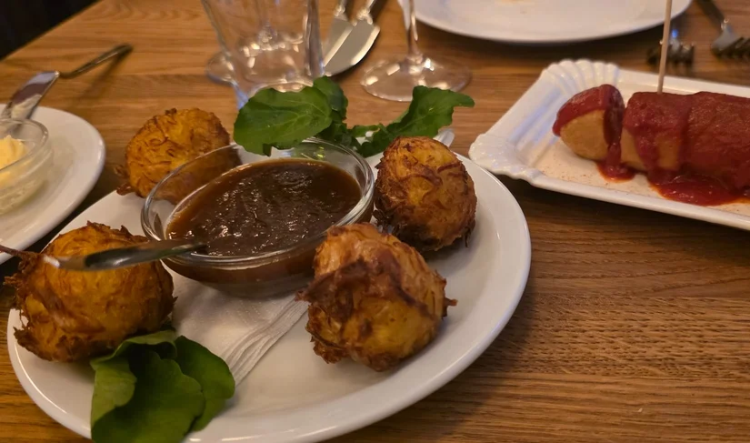 Natuurlijk konden we de Berliner curryworst niet weerstaan, net als de zuurkoolfritters. Die laatste zijn alleen al een bezoekje waard. Licht zurig, knapperig geserveerd met een fijne, lijkt een beetje licht gefermenteerd, appeldip. Heel fijn ook bij het glaasje aangeboden sekt. We weten nu al dat we snel terug moeten. Alleen al voor de Forellen Eisbecher en de Duitse Waddenoesters die nog op onze lijst staan.