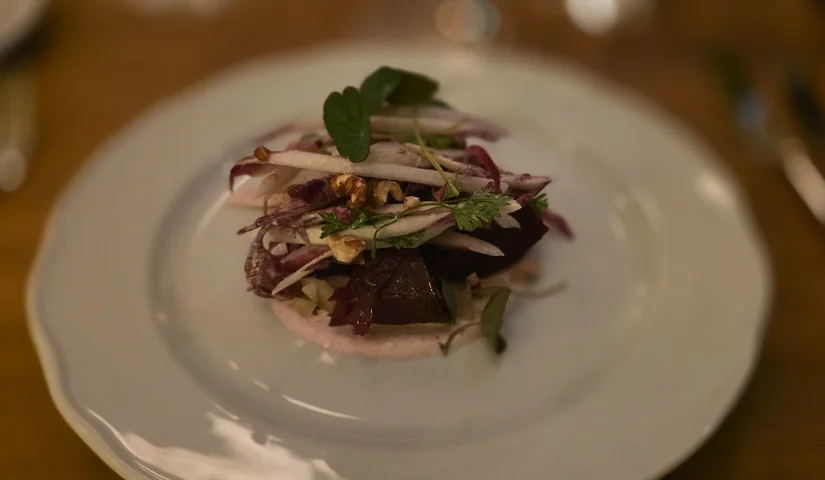 We starten simpel met de Reibekuchen met forelkuit. Aardappelpannenkoekjes met een frisse kruidensalade, forelkuit en een romige zure room met het pittige van mierikswortel. Gewoon een fijn gerecht om mee te starten. Tegelijk kwam de rode bieten salade op tafel. Koude biet met dungesneden roodlof, walnoot en een dressing van karnemelk met karwei. Die laatste geeft een leuk accent aan het gerecht.