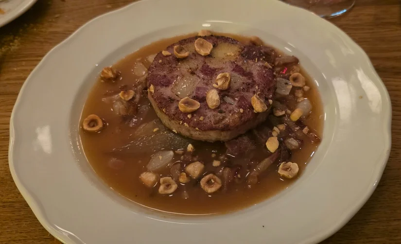 Het echte stevige Duitse werk zit meer in de Hauptgerichte. Helaas moesten we de Hühnerfrikassee en de Schweinehaxe bewaren voor een volgend bezoek. Wij gingen voor de vegetarische schnitzel. Hier gemaakt van pruikzwam (ook wel lion’s mane genoemd), mooi gepaneerd en goudbruin gebakken en verrassend vlezig van structuur. De selderijsalade verdient een plek in de bijgerechten. Die is echt supergoed. De Saumagen is een klassieker zoals wij niet kennen. Met varkensvlees en aardappel gevulde varkensmaag die krokant gebakken geserveerd wordt. In een jus met zilverui, spek en hazelnoot. Beetje vreemd misschien, maar wel heel lekker.