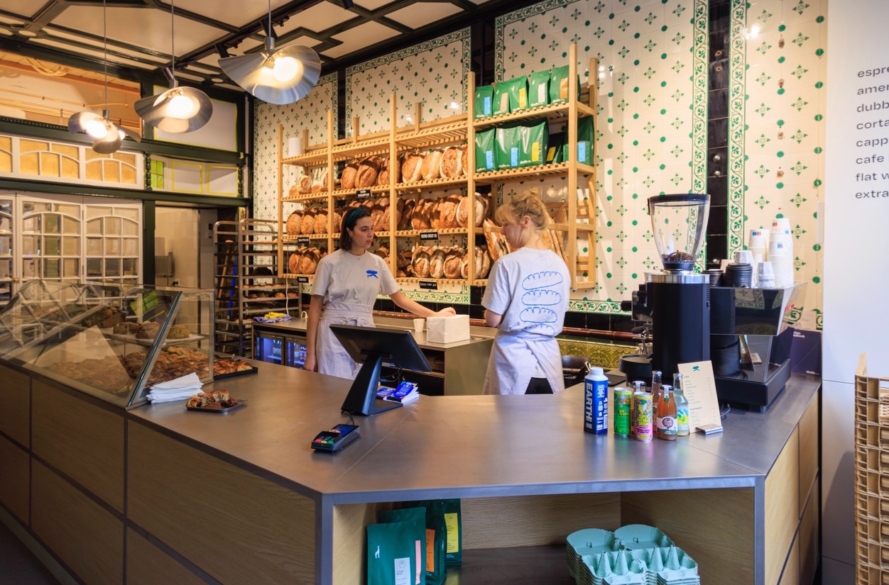 De nieuwe vestiging speelt in op de levendige locatie. Naast de verkoop van brood ligt de nadruk op lunch en koffie. Denk aan een dikke snee boerenbrood met artisjok en tomatensalsa.