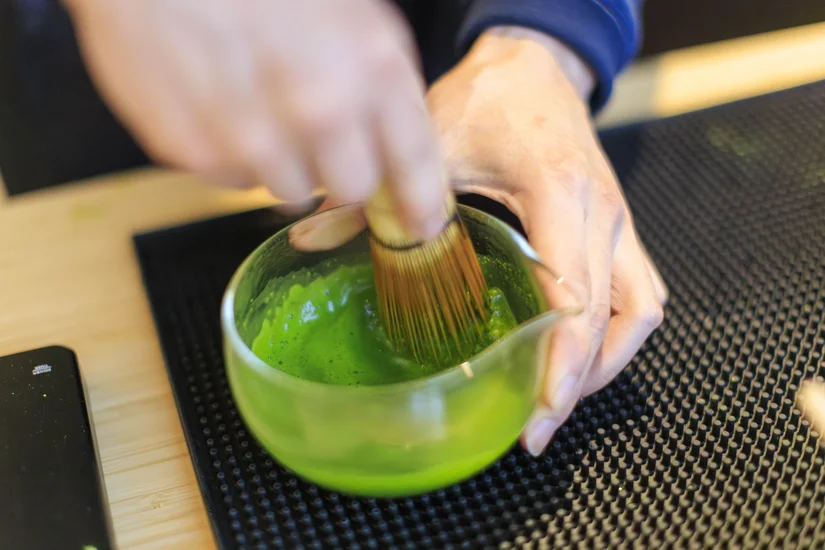 In de zaak schenkt hij twee soorten matcha. De variant uit Shizuoka komt uit een kouder en vochtiger klimaat, en dat proef je volgens hem: lichter, frisser, fruitiger. Die uit Kagoshima is afkomstig uit warmere, hardere grond. Daardoor is de smaak steviger, iets bitterder en meer nootachtig. Alles wordt op traditionele wijze bereid. Geen machines, maar met de hand ge-whisked, en dat mag iedereen zien. “We laten mensen graag zien hoe we het doen, ook omdat we matcha voor thuis verkopen.”