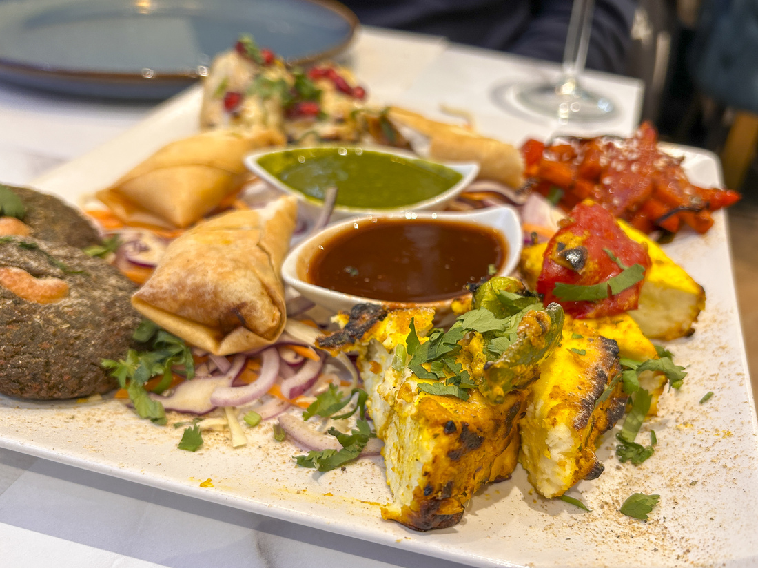 Meerdere gerechten komen tegelijkertijd op tafel bij wijze van voorgerecht: paneer (dat is een Indiase kaas), ‘kipstukjes’ van soja, gemengde groente in een kruidige rode saus en knapperige samosa’s met een koriandersaus. ‘Niet heel pittig’, verzekert de brigade ons. Nou, dan weet je het wel. Knap pittig.