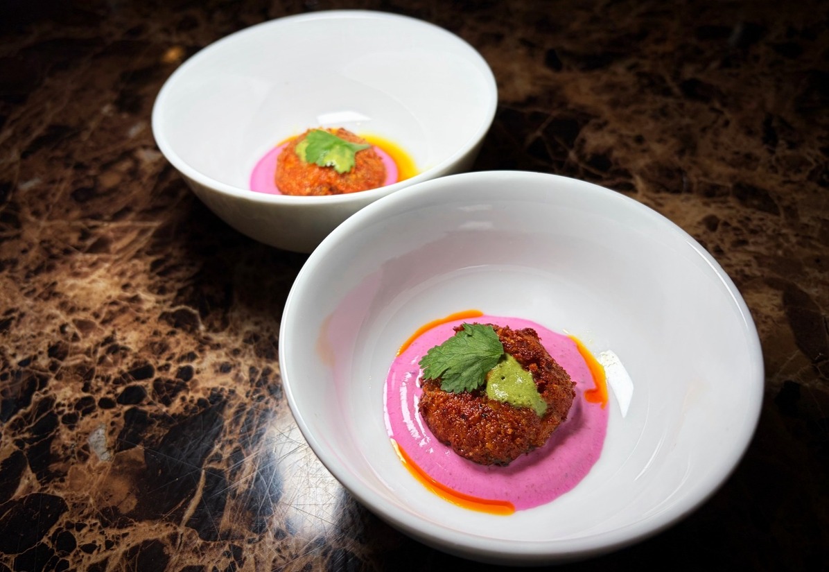 De avond start veelbelovend met een amuse: een gefrituurde linzenballetje met een verrassend sausje van rode biet en cottage cheese. De zoete smaak van biet gecombineerd met de knapperigheid van het balletje en een pittige kick waar je smaakpapillen van wakker schudt.
