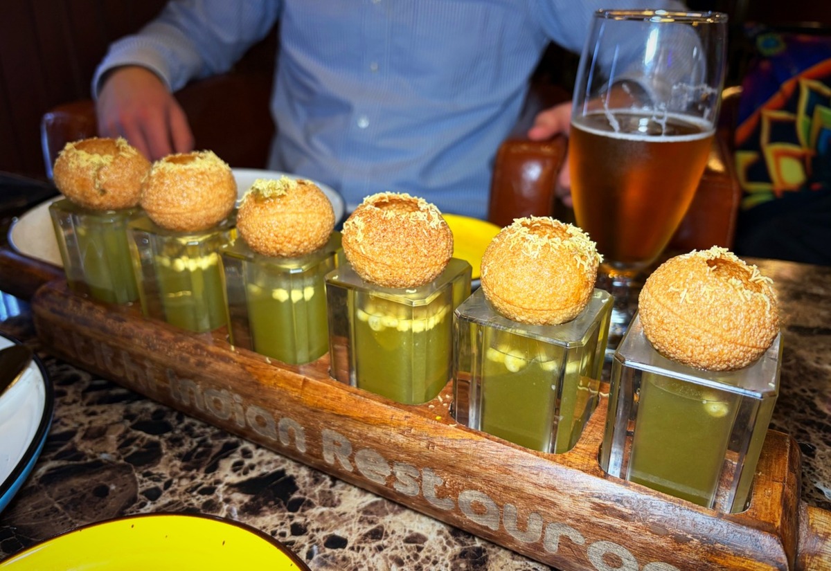 Dan komen de voorgerechten. De pani puri, knapperige holle balletjes gevuld met aardappel en kikkererwten, geserveerd met pittig muntwater. Het balletje vul je een beetje met muntwater en eet het in een hap, een letterlijke smaakexplosie in je mond. Zoet, pittig, knapperig, fris, alle smaken en texturen komen perfect samen.