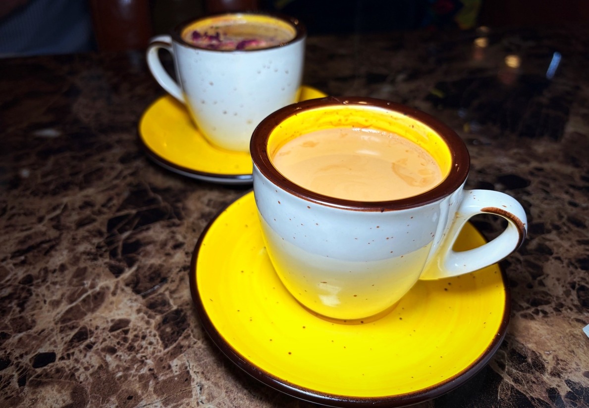 We sluiten de avond af met twee soorten chai, ideaal bij het koude, herfstige weer. De gulabi chai is geurig met kardemom, roos, saffraan, amandel en pistache. De masala chai is op traditionele wijze bereid met gember en kardemom. Allebei verwarmend en troostend.