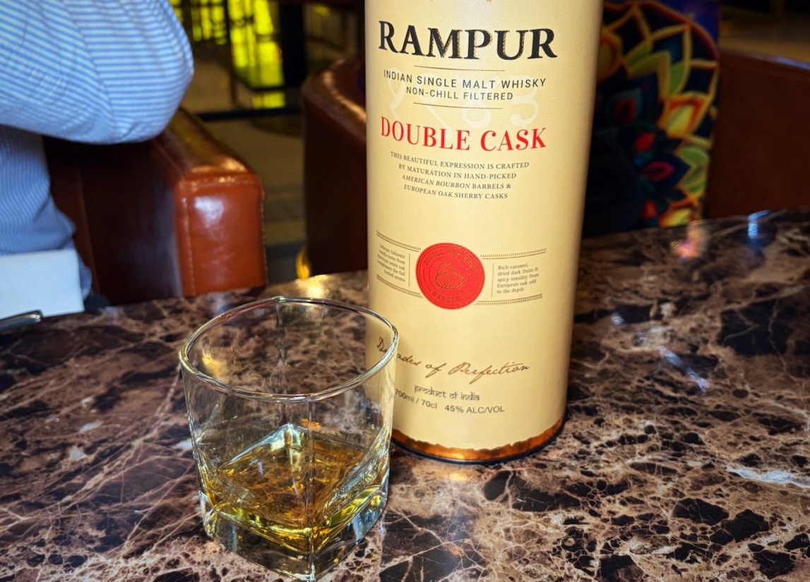 Tussen de gangen door proeven we twee Indiase whisky's: Rampur, een prijswinnende blend die laat zien dat India hoog scoort in de whiskywereld en Amrut, een single malt die soepel en complex is.