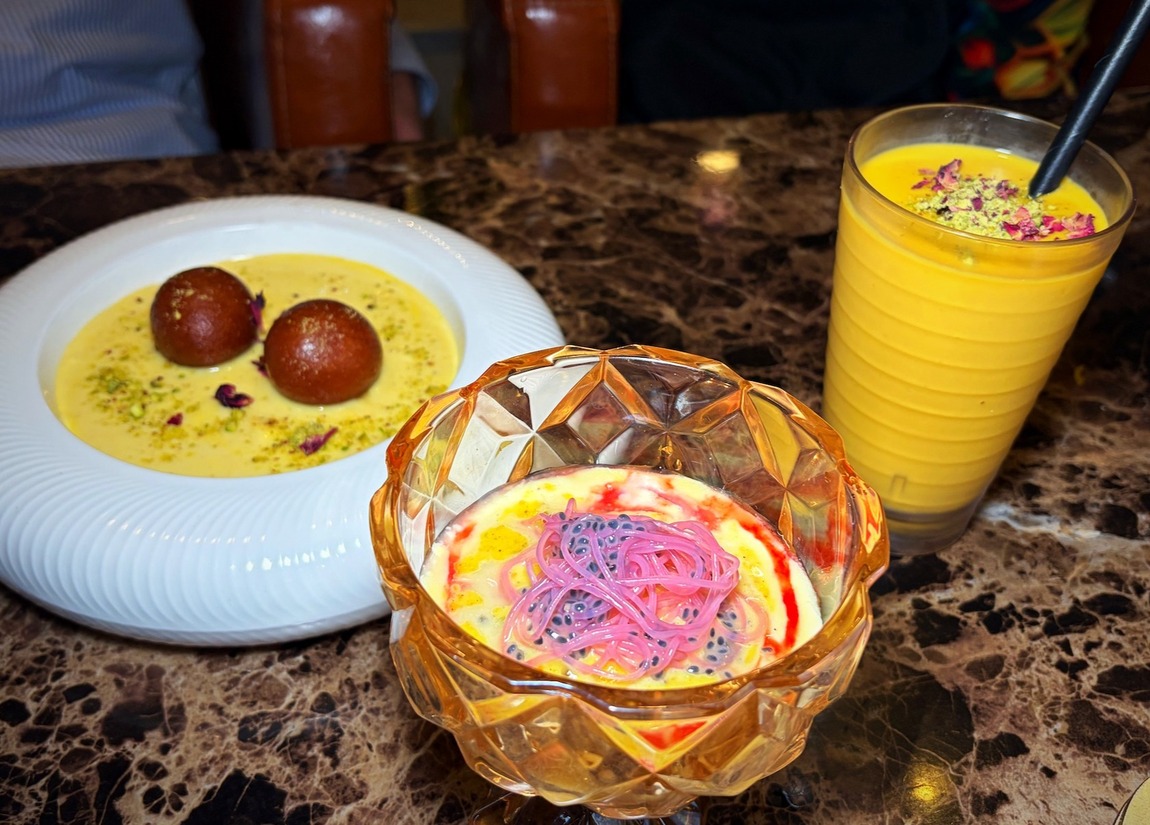 De mango lassi is fris en romig, een vertrouwde klassieker die perfect uitgevoerd is. De rabri kulfi faluda is een mix van texturen: laagjes ijs met rabri, saffraan, zoete basilicumzaadjes en vermicelli. Elke hap is anders, elke lepel een nieuwe ontdekking van smaken en structuren.