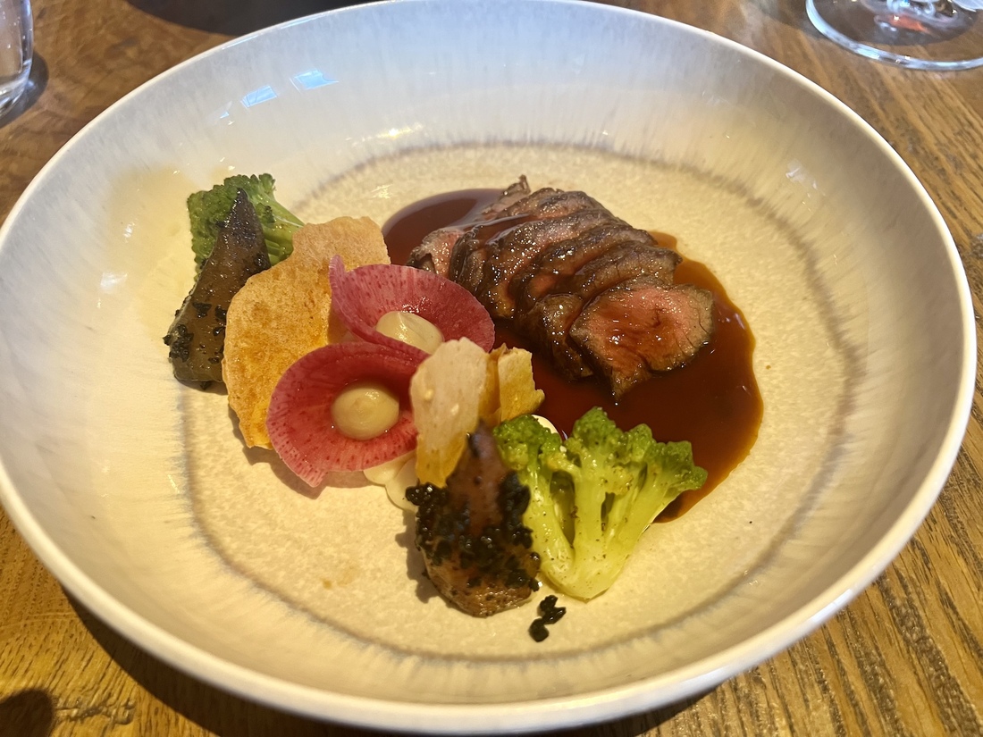 Het hoofdgerecht is meer klassiek, maar smaakt eveneens goed. Een keurig gebakken steak in een rijke, lekker plakkerige saus van malt, met knapperige groentes, een dun kaaskoekje van de pittige Comté en snippers gedroogde olijf. Het vegetarische bordje is iets minder elegant, met lekker zoet gebakken dobbelsteentjes knolselderij, romanesco en nootjes, maar ook een paar flinke klodders wat al te machtige Hollandaisesaus.