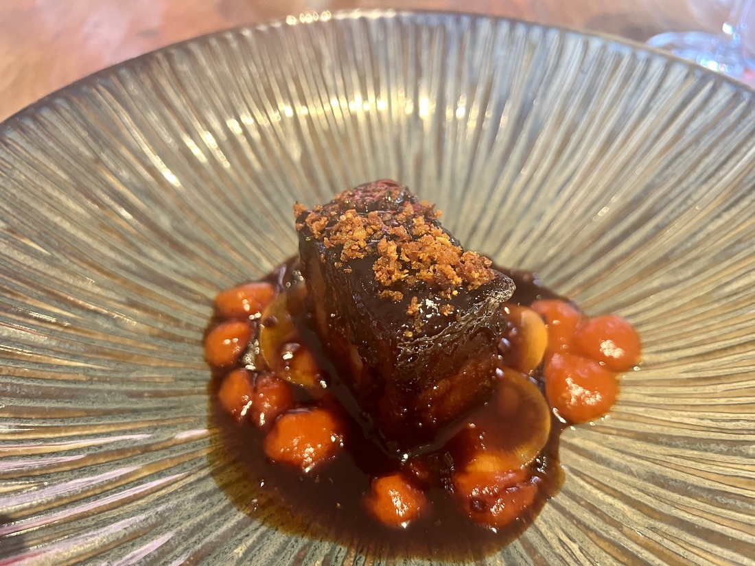 Klassieker op de kaart is het buikspek, die sous vide is gegaard, gebakken en afgelakt met barbecuesaus. Vet, zacht vlees, erbij dotjes zoet-rokerige paprikapuree, gedroogde uitjes en tinteltjes Szechuan peper, die het rijke gerecht wat omhoogtillen. Nooit meer van de kaart halen, en dat zijn ze naar het lijkt ook niet van plan.