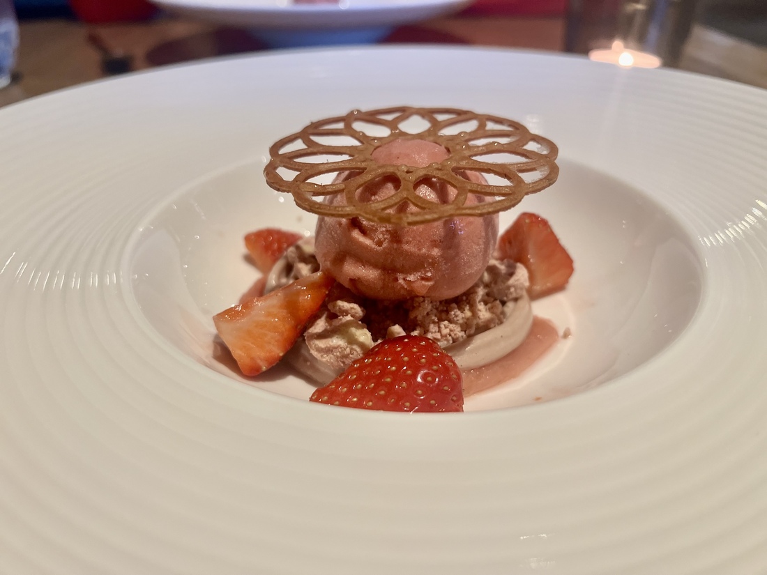 Het dessert verdient tot slot ook nog vermelding. Aardbeien en ijs daarvan, zeezout, een crumble van rabarber en witte chocolade en een siroop van rozenwater. Mooi in balans met bitter en zoet, Maldon zeezout geeft een verrassend randje en prononceert de smaken. Heerlijk.