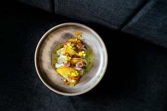 We eten een paar mooie gerechten, zoals kabeljauw met druifjes, gedroogde ui, een krokantje van mierikswortel, dragon en een vleugje bergamot. Fris en fijn zuur, maar ook rijk. Net als daarvoor de mooi gebakken doradefilet, met een blok notige quinoa, aangebakken avocado en dotjes dashi-mayonaise.