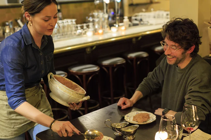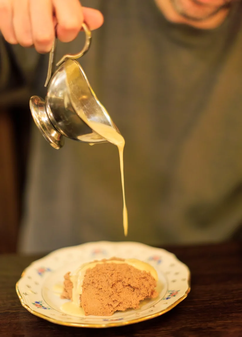 Laure serveert huisgemaakte chocolademousse aan tafel vanuit een klassieke porseleinen terrine. Boers lepelt ze de mousse op onze bordjes terwijl ze de serveerschaal inning aan haar borst klemt. Ze schenkt er warme vanillesaus bij.