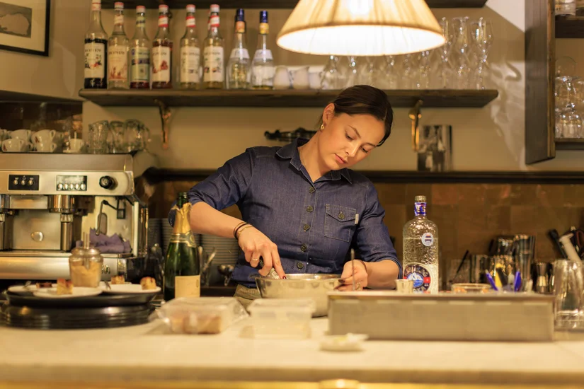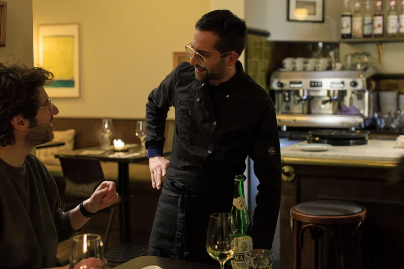 Bladspinazie met parmesancrème in bladerdeeg geeft een eerste glimp van Cardone’s invloed. Het gerechtje is zacht. De emulsie van de parmesancrème is prettig. Zure, zoute, en aardse smaken zijn perfect in balans. We zouden er zo nog een lusten.