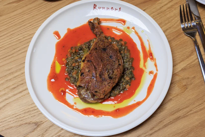 Bestel gerust Confit de Canard of gekonfijte eendenpootjes bij Runners. Het vlees smaakt heerlijk romig en de huid is krokant. Linzen doen het er goed bij en de worteljus geeft het gerecht een leuke zoete por. We kunnen ons goed voorstellen dat we een blokje om doen voor dit gerecht
