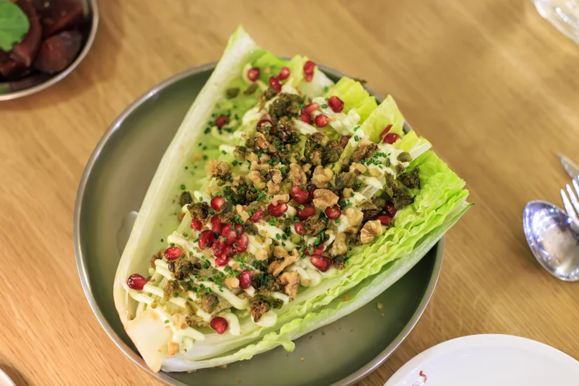 We worden op onze wenken bediend. Het bijgerecht romainesalade met basilicumdressing en walnoot is een lust voor het oog. We krijgen een halve krop gepresenteerd zoals we dat nergens eerder zagen. Gefrituurde kapper en granaatappelpitten tillen smaak en presentatie omhoog. We eten graag een frisse salade bij ons eten. Dat is precies het advies om dit gerecht verder te perfectioneren. Serveer als salade in plaats van kropvorm zodat de Romain ook dressing draagt. Zo wordt het gerecht ook gemakkelijker te delen.