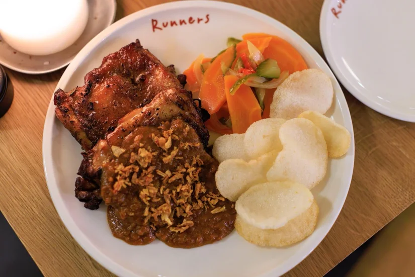 Runners serveert saté als gevleugelde kippendij met smaakvolle satésaus. Vol van smaak en perfect pittig: er zit ziel in deze saus. De kip is mals en sappig en het geheel maakt ons blij. Het weglaten van de klassieke kip-op-stokvorm maakt dit gerecht te luxe voor een eetcafé en perfect passend bij een brasserie. De ingelegde groenten zijn krachtig van pit en zuur, wat zorgt voor een potige atjar.