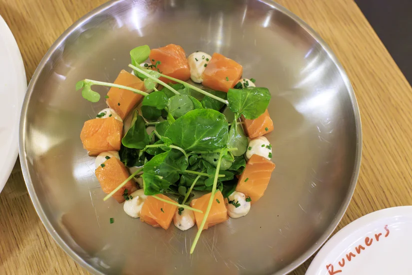Als tweede klein gerecht bestellen we zalm met mierikswortel-crème fraîche. Het roestvrijstalen bordje ‘Zalm Runners’ springt in het oog. De crème fraîche is lekker en combineert goed met de zalm en de pittige cress. De presentatie is kleurrijk en eenvoudig. Van een gerecht dat de naam van de zaak draagt, verwachten we de volgende keer een meer spannende bereiding.