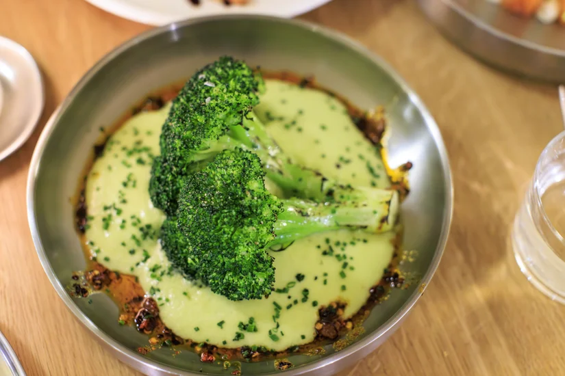 We genieten van broccoli met vanille-limoendip en crispy chili. De stronk is precies goed gegaard en lekker licht gebrand. De dip heeft meer weg van schuim en het geheel heeft een aangenaam mondgevoel door toevoeging van crispy chili-olie. Runners laat met dit bordje zien dat de witte brigade wel raad weet met groenten.