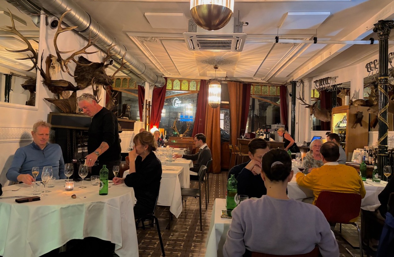 Binnen voelt het alsof je aanschuift in de huiskamer van een jager. Aan de muur hangen trofeeën, in de koelcel hangen imposante karkassen van herten als stille belofte van wat er komen gaat.
