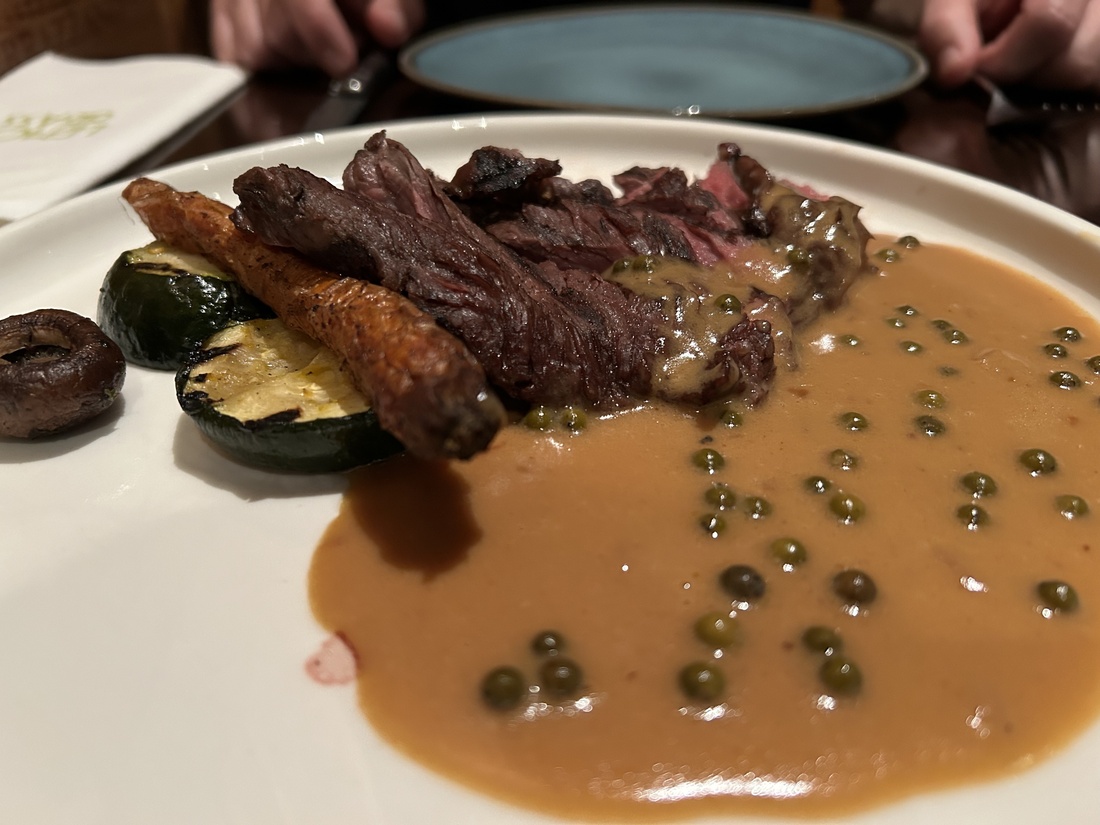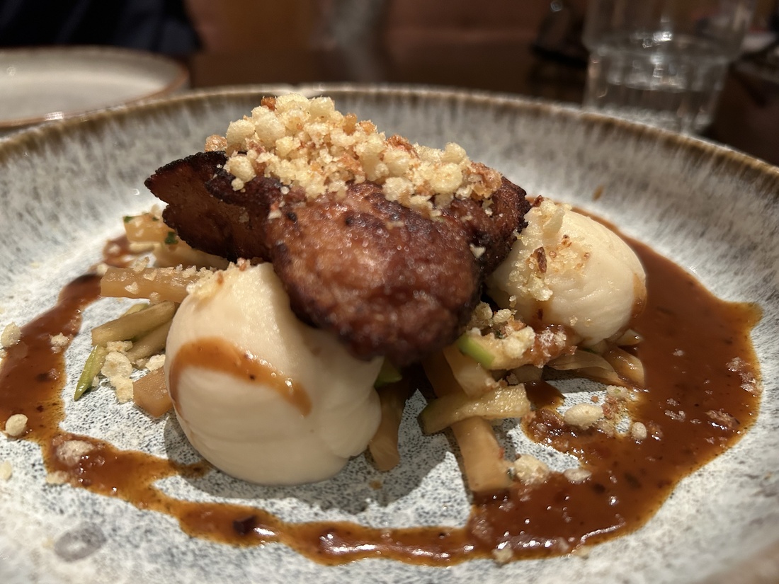 We vervolgden met een ‘risotto’ van bloemkool met zoete aardappel en coquille. Verfrissend, een aangename pittigheid, goed gegaard. Ook de kalfszwezerik met pepersaus en knolselderij mocht er zijn. Leuke en lekkere gerechten die zich goed lieten delen.