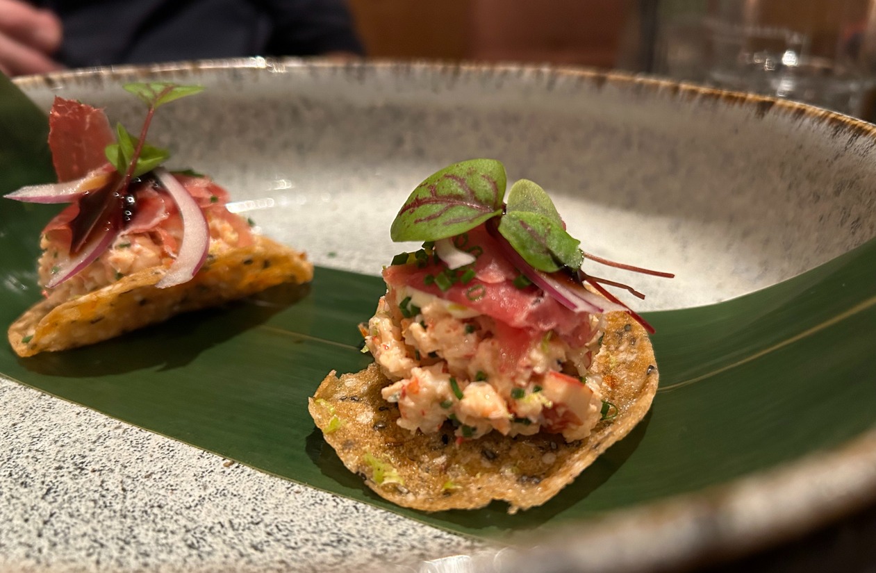 Eerste hap: sesamcrackers met pata negra, tartaar van kreeft en unagi. Een gerechtje met een mooie balans tussen zacht, krokant, romig en zilt. De unagisaus, een donkere Japanse saus die je meestal op paling ziet, is een goede vondst.