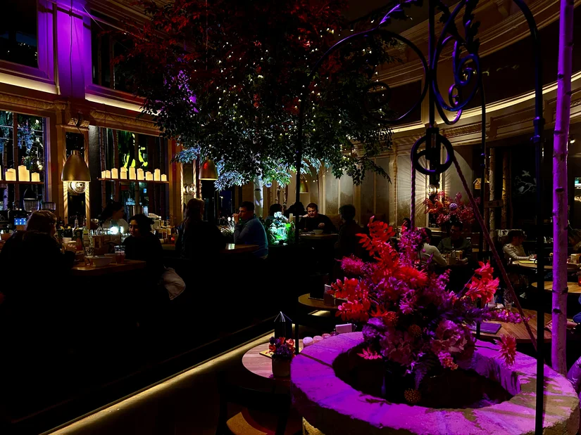 Langs een roze opgelichte wensput en door een bos van berkenstammen leidt de weg naar onze tafel. Overal flikkeren kaarsen en kleine lampjes veranderen in vuurvliegjes bij het knipperen van onze ogen.