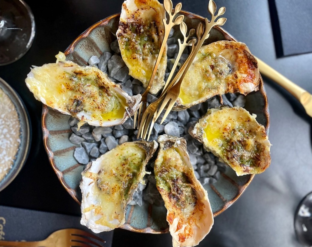 We drinken een volle en fruitige Sancerre, die goed zou passen bij wat er allemaal aankomt. En dat blijkt: we krijgen goede vlezige oesters, waarvan een deel gegratineerd is met Gruyère-kaas en Pernod. Ziltig, vettig en met een fruitige wijn; zalig!