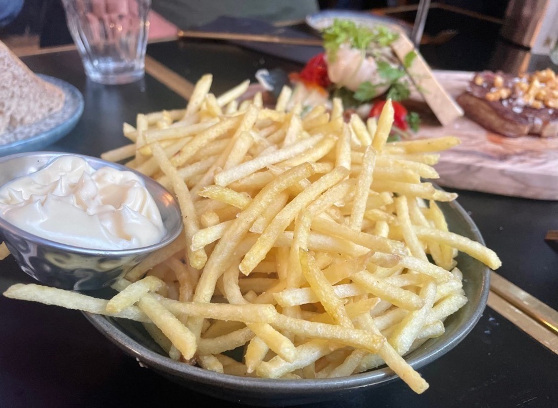 Daarnaast een dubbel gevlinderde makreel, wat inhoudt dat hij overdwars open is gebakken waardoor hij een knapperige huid heeft en zacht vlees. Als bijgerecht krijgen we zogenaamd ‘steppegras’, de allerdunste en knapperige frietjes die we ooit hebben gezien.