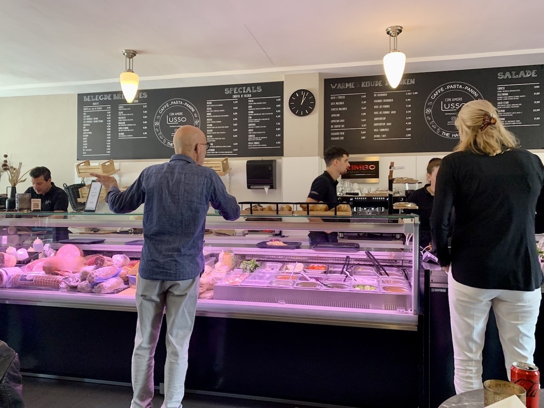 Lusso is al vijftien jaar te vinden op deze fijne plek. Rond het middaguur vormt zich hier een lange rij met hongerige mensen, die al ver buiten de ingang begint. Dat is veelzeggend: in de zaak is het dus volle bak. De vriendelijke Italiaanse eigenaar staat achter de snijmachine de vleeswaren ter plekke in dunne plakjes te snijden, terwijl de rest van het personeel als een geoliede machine bestellingen opneemt en broodjes en andere gerechten klaarmaakt.