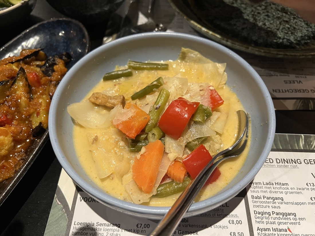 Niet ieder bordje eten is er een voor in de boeken. De flinke laag zoetpittige sambal die de ikan pepesan omhult is te krachtig om de vis nog goed te proeven, de sayur lodeh (gestoofde kool en beetgare groenten in kokosmelk) is aan de waterige kant. Maar toch gaan ze schoon op, zoals dat gaat.