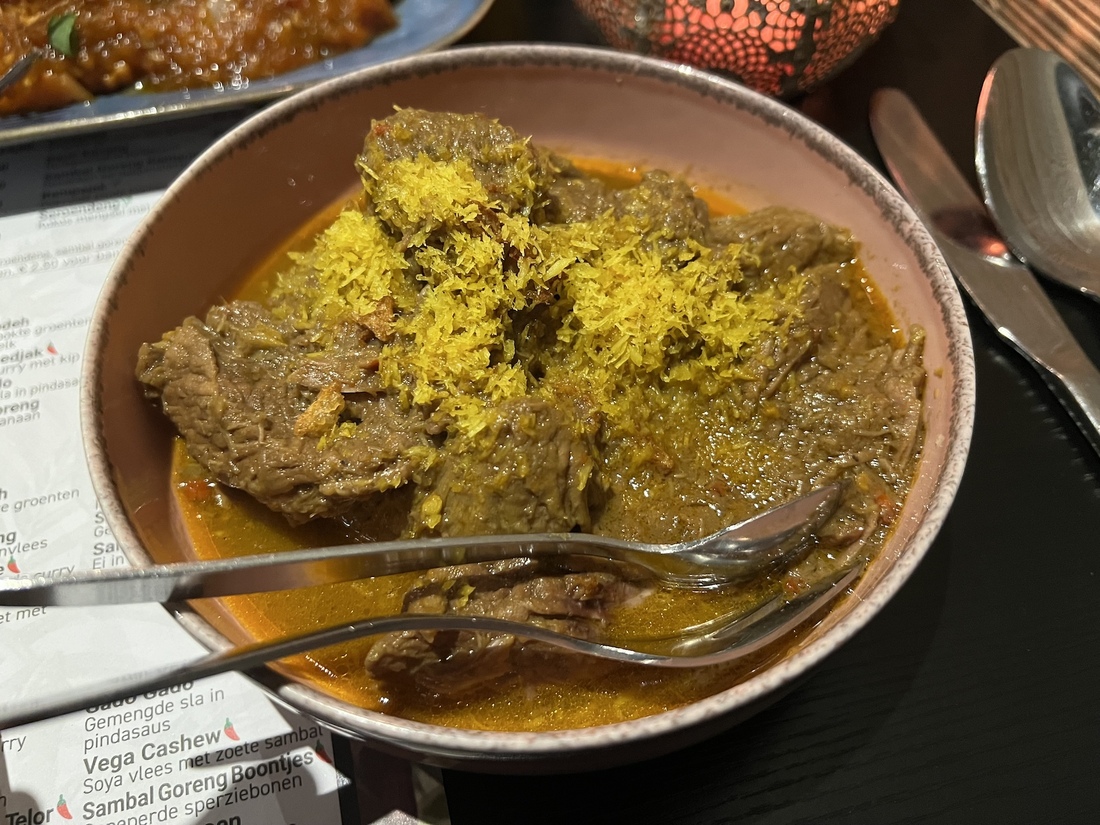De saté van Istana mag in Den Haag wereldberoemd zijn, de rendang mag er ook wezen. Mijn mede-eter wijst me er daags na het diner op dat je rendang ook kunt zien als een fase in plaats van als een gerecht. Met het vlees in nog waterige kokosmelk (of eventueel ander vocht) heet het gulai. Wordt de consistentie al dikker, na nog een paar uur inkoken, dan heet het kalio. De eindfase, zacht gestoofd vlees die een is geworden met een kleverige, ingedikte saus, heet rendang.