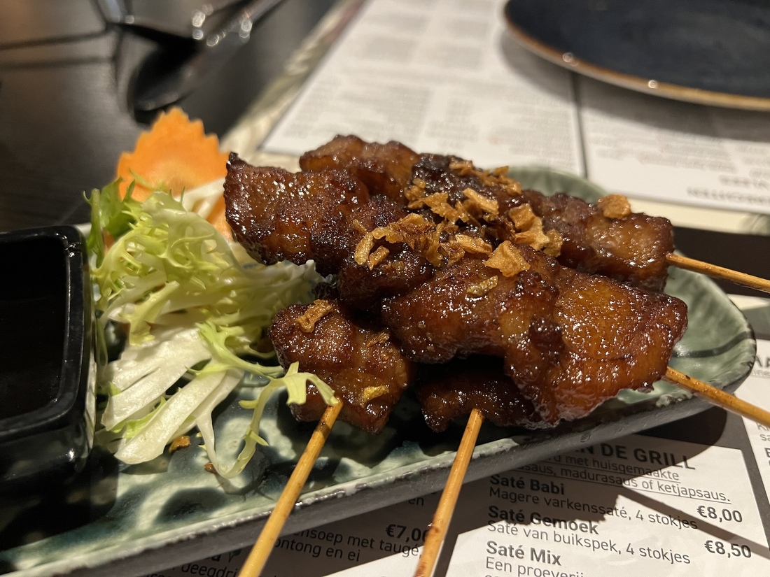 Eigenaar Ronald vertelt dat Hollandse gasten nog weleens willen mopperen over de grootte van het vlees aan de stokjes. Het zijn inderdaad bescheiden porties. Maar dat hoort ook zo: kleine stukjes betekent veel smaak, malsheid en geblakerde, knapperige randjes hier en daar. Je zou toch gek zijn om daarover te klagen.