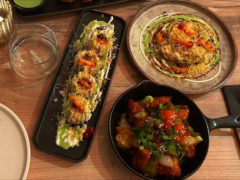 Er wordt ons een selectie van voorgerechten voorgesteld. We laten ons daarmee verrassen. Dahi Puri, Chilli Chicken, Aloo Tikki Chaat, Onion Pakoda en Chicken Tikka verschijnen niet veel later op tafel.
