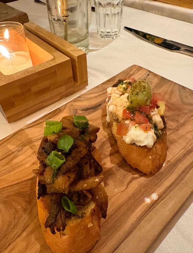 Wij kozen voor het chefs menu van vijf gangen, zorgvuldig samengesteld door de chef. We begonnen met twee soorten bruschetta, eentje met tomaat en burrata en een variant met op houtskool gebakken champignons. Een verrassend goede start: vol smaak, vers en met aandacht opgemaakt.