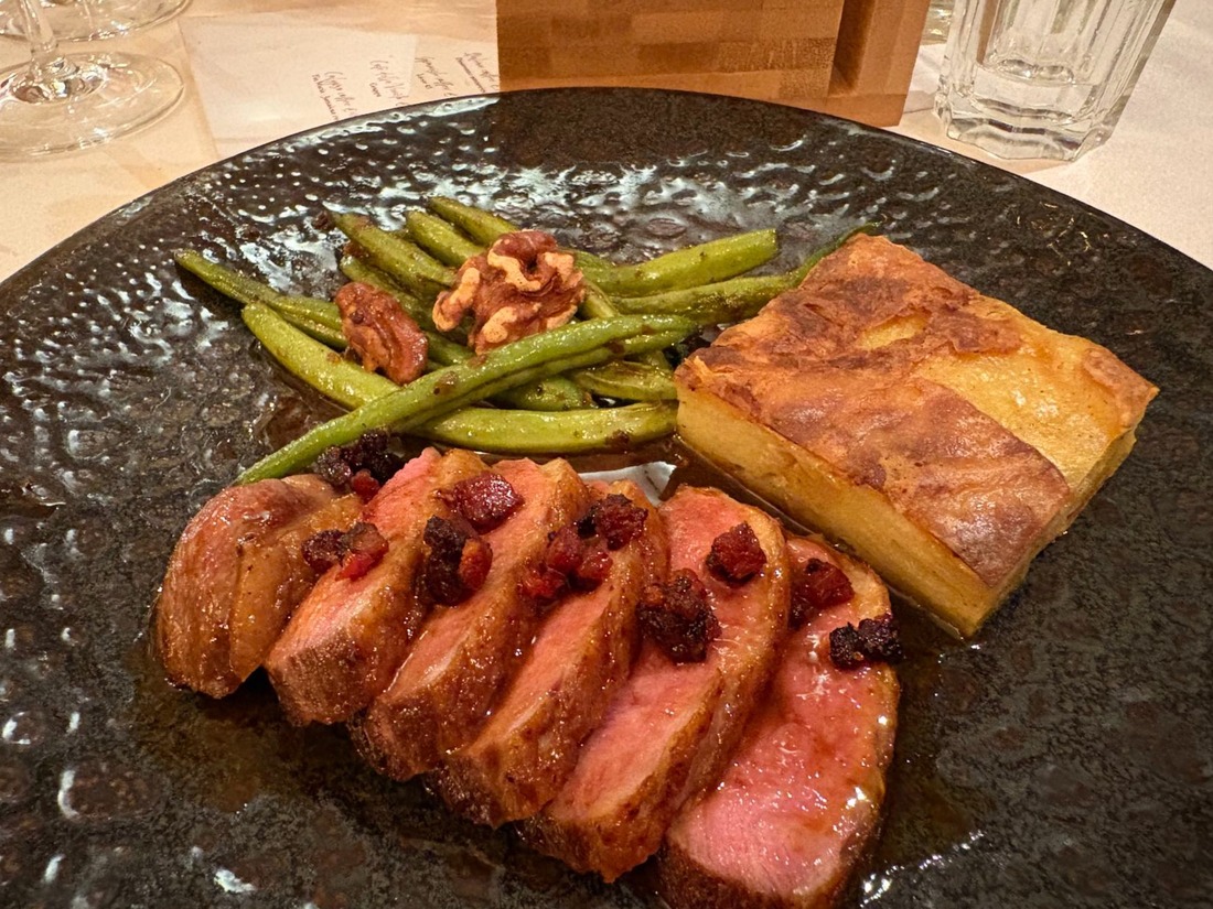 Vervolgens genoten we van canette de Périgord (eendenborstfilet uit de Périgord), geserveerd met eendenjus, chorizo, aardappelgratin en walnoten. De eendenborst was precies zoals het hoort: licht krokant van buiten en zacht en rozig van binnen.