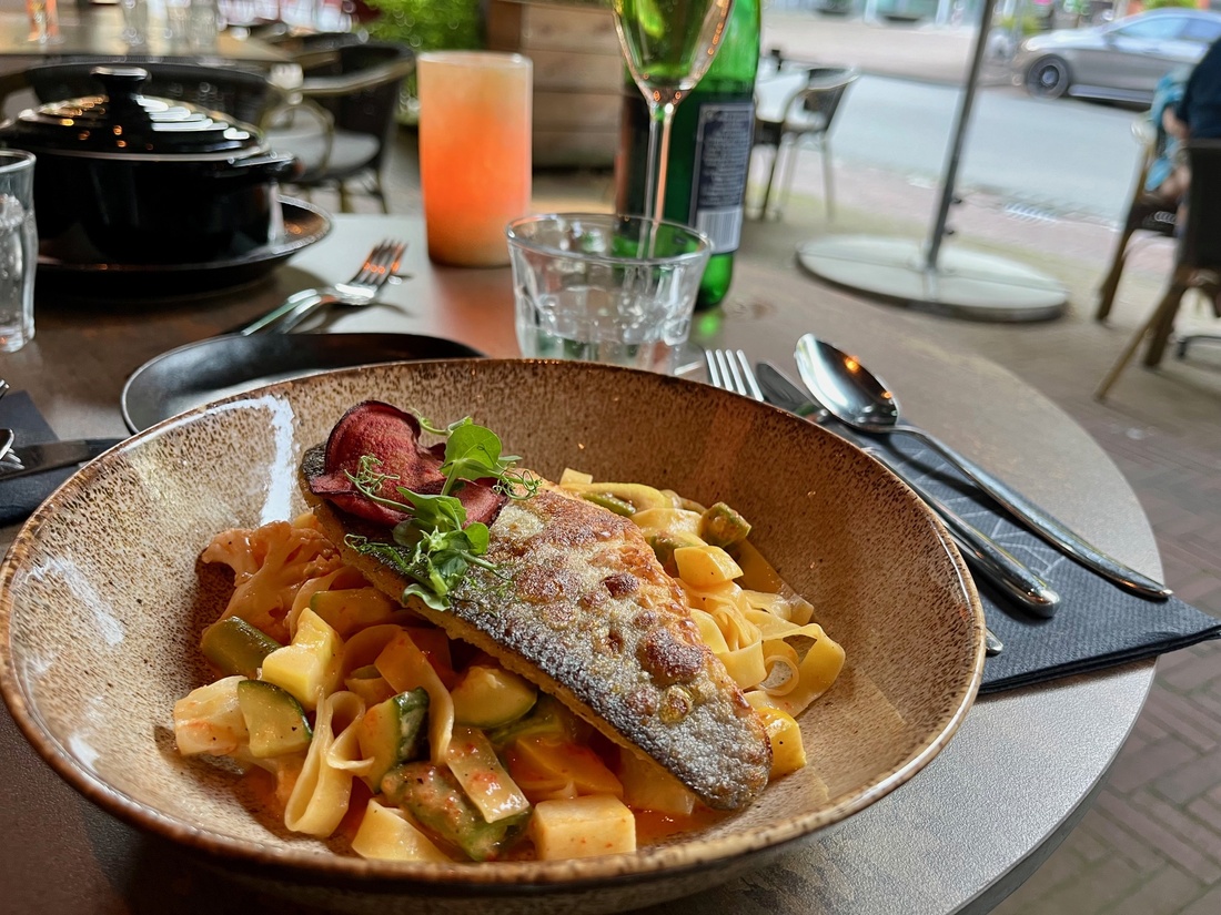 De vis van de dag is vandaag zeebaars. Een knapperige, op de huid gebakken filet ligt boven op een goede portie tagliatelle. Naast dat die mooi al dente is, waarderen we dat er lekker veel groentes in de gerookte paprika- en venkelsaus te vinden zijn. We zien groene en gele courgettes, asperges en kleine bloemkoolroosjes. De vitamines zijn weer binnen.