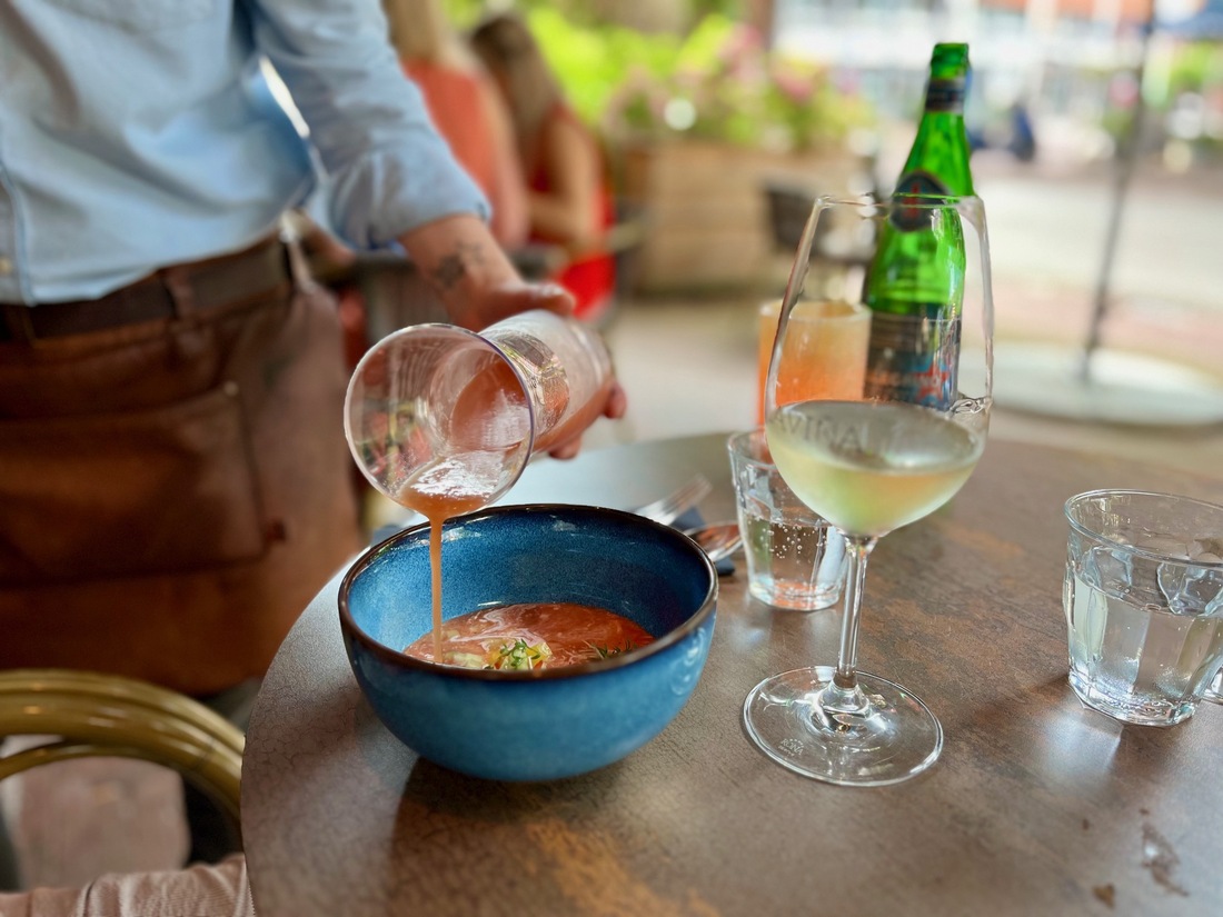 Brunoise gesneden gele en rode paprika, komkommer en waterkers en een scheutje room worden aan tafel overgoten met de verse tomatensoep. Licht pittig door het pepertje en toch koel van temperatuur. Die Spanjaarden weten wat lekker is op een warme dag en chef-kok Joeri Rodenrijs maakt hem perfect.