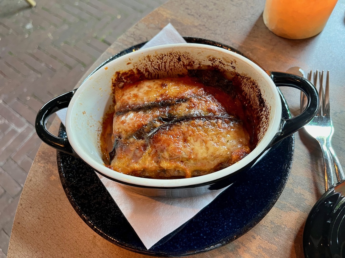 De melanzane alla Parmigiana; aubergine, tomaat, basilicum en kaas uit de oven, wordt hier als lasagne geserveerd in een ovenschoteltje. Hoewel het geen slecht gerecht is, ben ik misschien te verwend geraakt door de versie van mijn schoonmoeder, die bijna verdrinkt in de mozzarella en Parmezaanse kaas. De lasagnebladen hier maken het geheel net wat droger en iets meer kaas erdoor zou het wat ons betreft net wat hoger op smaak brengen.