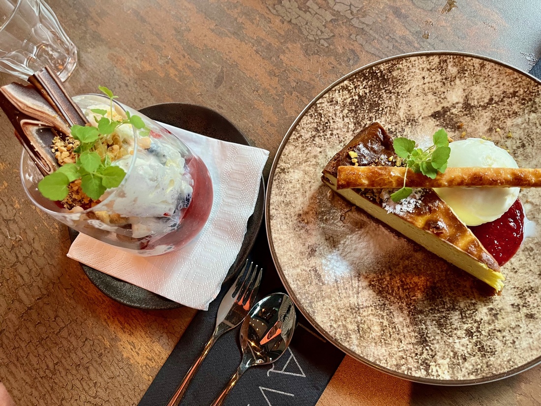 Toe nemen we de Eton mess en de pistache cheesecake. Pistache is momenteel weer erg in trek door de hype rond de ‘Dubai reep’. In deze zeer compacte cheesecake is het nootje goed te proeven, maar niet overheersend. De bol witte chocoladeijs past er goed bij. We vragen ons af of die van de ijssalon naast het restaurant komt, maar zij blijken niet aan horeca te leveren.
