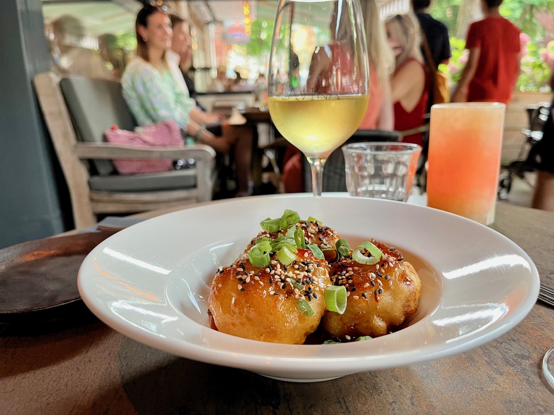 Uit die wijnkelder drinken we een rosé Cava met een aangename bubbel en een vrij volle verdejo bij de Koreaanse bloemkool dakgangjeong. Gegarneerd met lenteui en wit en zwart sesamzaad, liggen drie roosjes in een deegjasje in een zoet pittige saus. Normaal is bloemkool niet onze eerste keus qua groente, maar dit veganistische gerecht mag je niet missen. Lekker zoet, krokante buitenkant. We denken even aan een oliebol, maar dan gezonder en exotischer.