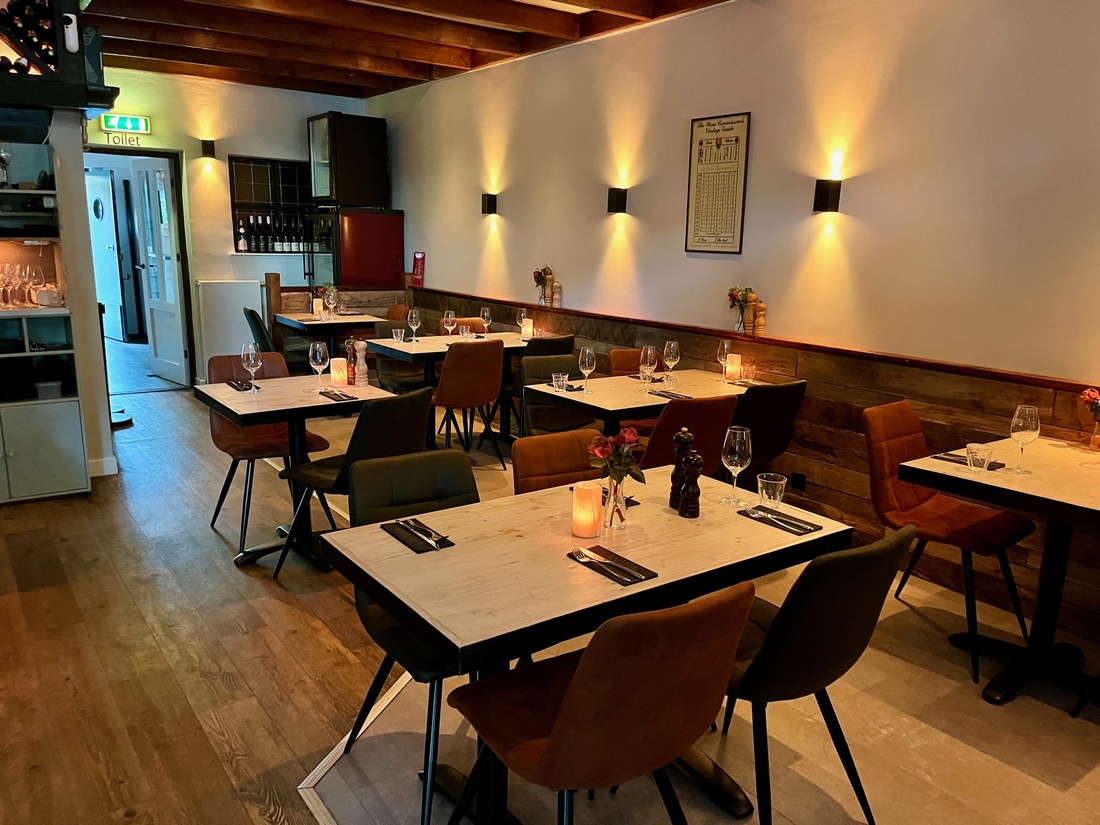 Binnen heerst een knusse sfeer door de oude bakstenen, houten balken en zachte verlichting. Beneden is een heuse wijnkelder, waar het ouderwets gezellig gemaakt kan worden voor privédiners, feesten en partijen.