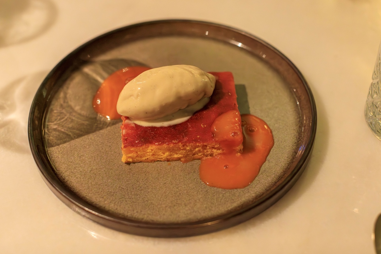 We sluiten af met cake van duindoornbes, ijs van bruine boter en duindoornbessensaus. De cake is bereid in de houtoven, want een normale oven heeft Moose niet. We vinden het altijd leuk om lokale duindoornbes in gerechten tegen te komen. De saus is lekker zurig en biedt mooi tegenwicht aan het ijs.