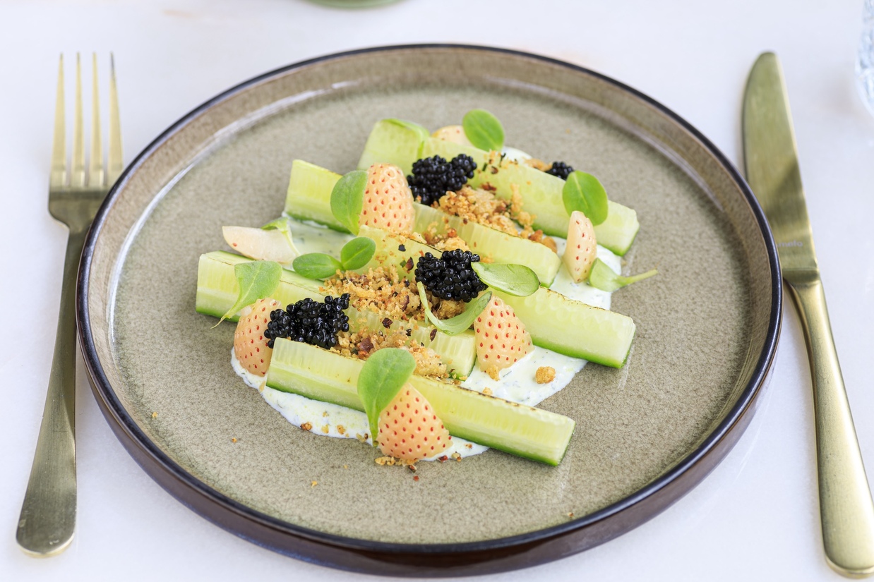 De start is goed. Het platbrood uit de houtoven is overheerlijk. Moose serveert er bruine boter en een mousse van rode biet, yoghurt en za’atar (kruidenmengsel uit het Midden-Oosten) bij. Het bordje komkommer met citroenmelisse kwark, witte aardbei en kabeljauwkuit ziet er prachtig uit en is makkelijk te delen. De stukken komkommer zijn duimdik, lauwwarm, en lekker om in te bijten. We vragen ons af hoe het gerecht koud zou smaken, in een bereiding waarin fris en zuur de overhand zouden hebben in plaats van gerookt en zilt.
