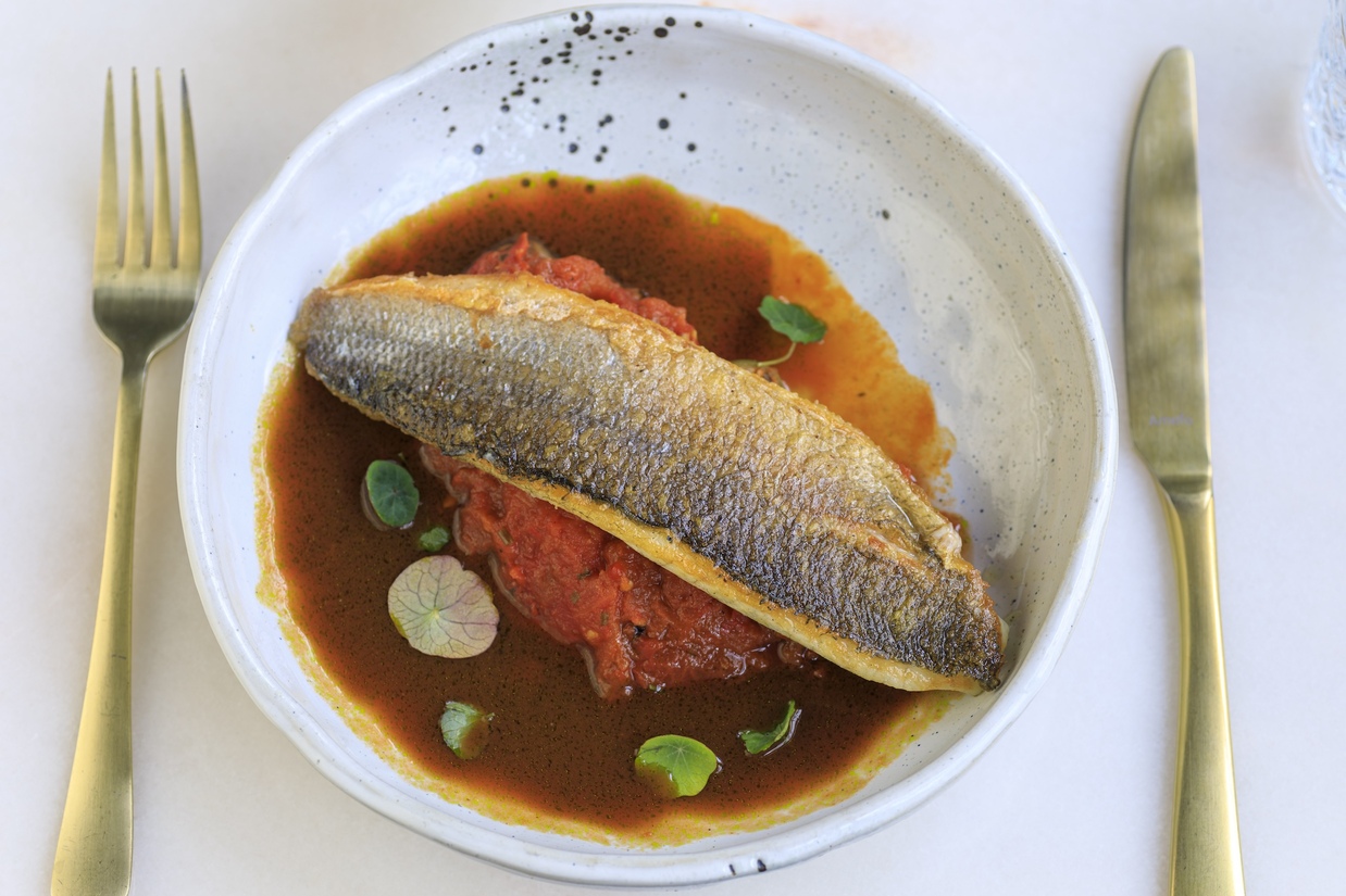 Je kent het wel. Een gerecht waarvan je nog een bordje wil bestellen. Zoals de gestoofde varkenswang bij Wijncafé Marius een paar maanden terug. De zeebaars van Moose streelt het oog en de tong. Het filetje wordt gereserveerd op geroosterde tomaat met kappertjes en lavas (maggiplant). De smaak van lavas zit er duidelijk en heerlijk aan. Het gerecht smaakt rijk en comfortabel en de vis blijft knap overeind. Dit is een bordje waarvoor we terugkeren en omfietsen.