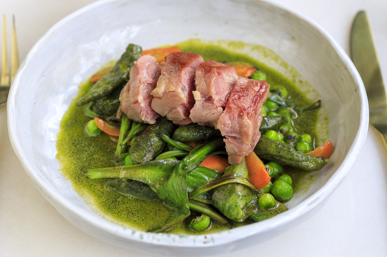 Ons tweede hoofdgerecht lijkt de culinaire filosofie Moose op een bord te zijn. Erwt, peul en wortel zijn perfect gekookt, vermengd met spätzle (een Zuid-Duitse deegwaren-specialiteit) en daslook en overgoten met lekkere saus. Vier stukjes lamsnek met perfecte garing liggen getrancheerd (en niet overgoten met saus) bovenop de groenten. Veel eerlijker wordt een gerecht niet. We zien precies wat we eten, we proeven elke ingrediënt en alle smaken zijn puur.