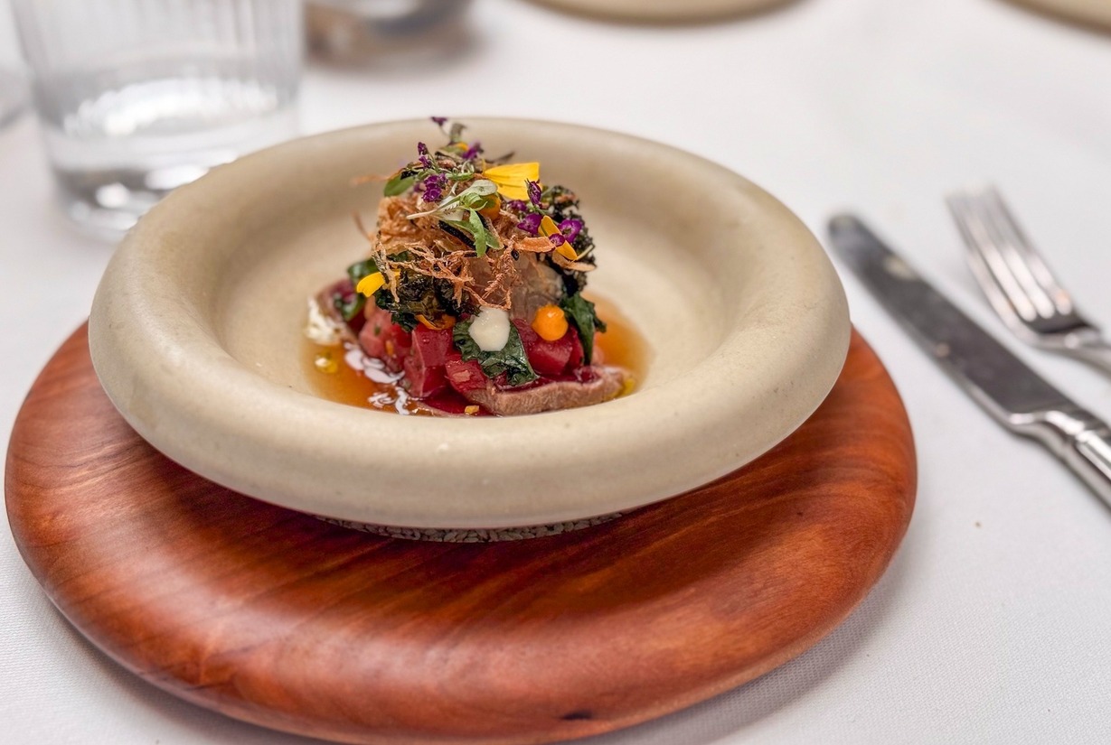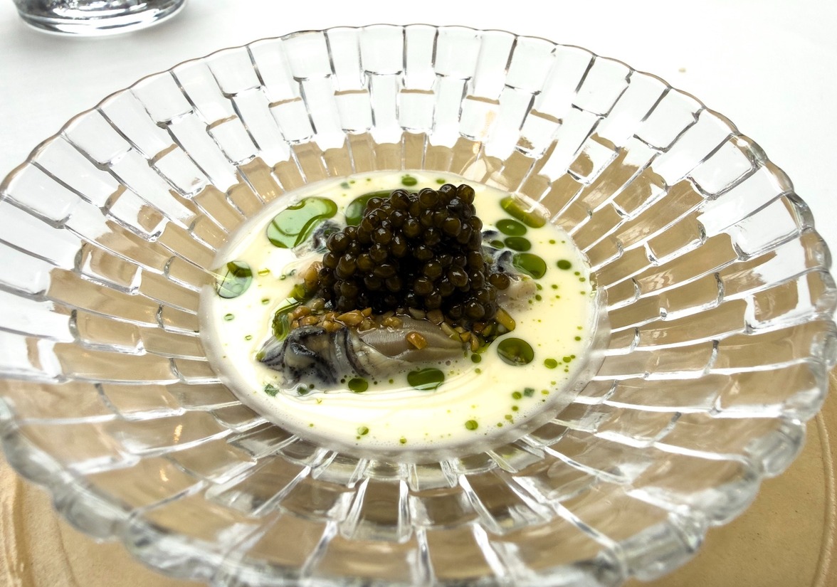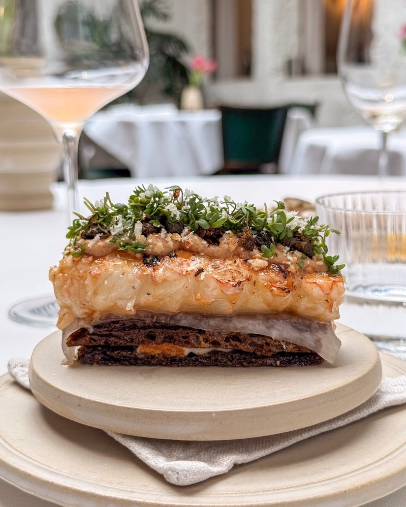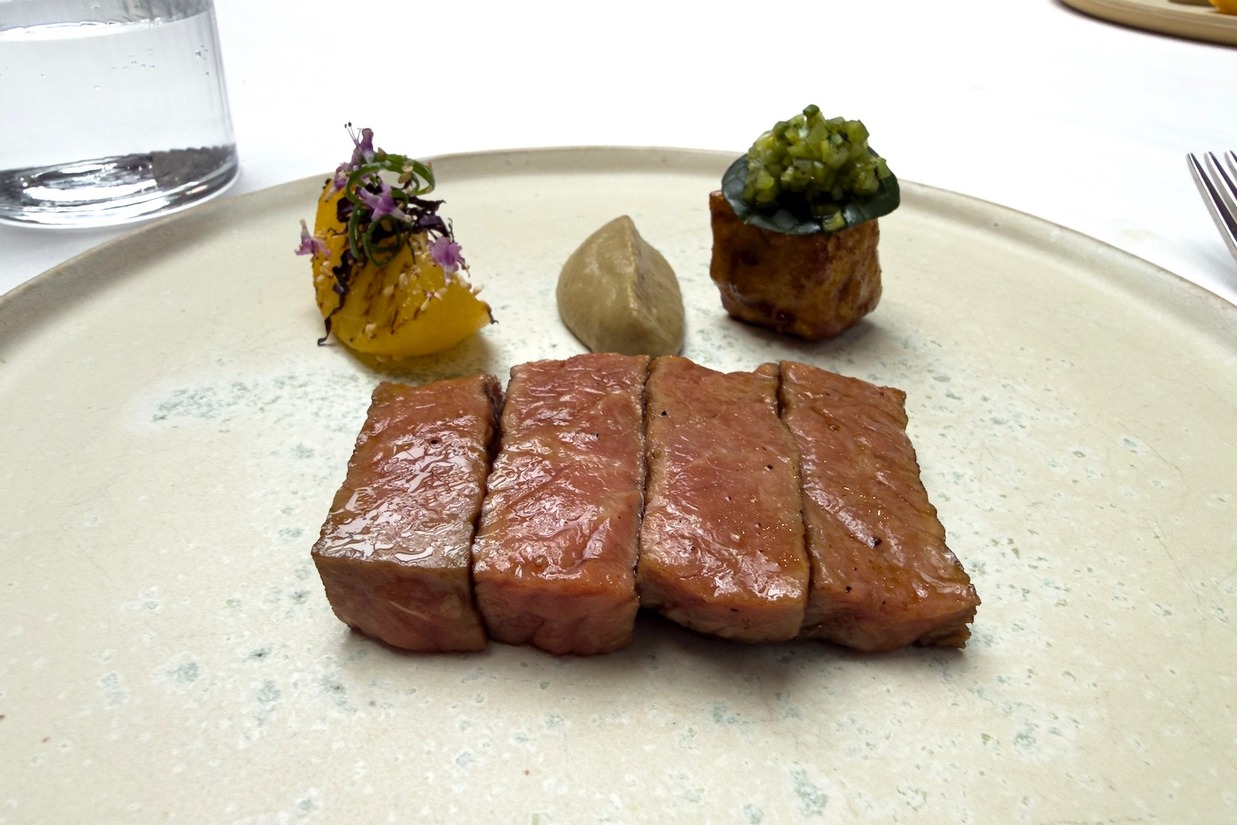 De amuses zetten meteen de toon. De custard van eekhoorntjesbrood met pata negra is romig, diep en verrassend licht. Het vormt een perfecte binnenkomer. De Irish Mór-oester met zonnebloempittenijs is misschien nog opvallender: zilt, koud, romig en zacht tegelijk, een hap waarin contrast en harmonie elkaar vinden. Het is precies dat soort vondsten waar je stil van wordt.